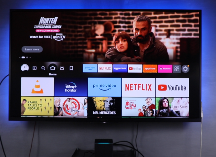 The Fire Cube TV is running on its own Fire OS-based UI, which is fluid in terms of experience. It takes no time to switch between apps or menus. We have used 2nd Gen Fire Cube TV on a long-term basis, so the 3rd Gen feels a lot faster with snappy performance. The initial setup needs some time, as it will download and install the latest software before the first use, but it is simple. It will sync all the apps if previously used, and you will be required to log in to each app separately. Once the Fire TV Cube is on, you can give commands like –